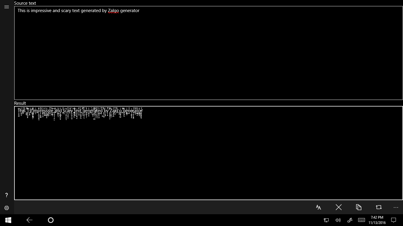 Creepy Zalgo Text Generator : Zalgo Text / The zalgo effect creates chaotic, creepy, and unreadable text with the feel of a horror movie and a sound of metal.. Use the converted text on facebook, instagram, twitter, youtube, gmail, word or blog comments. Zalgo is an internet meme which was started by dave kelly. In that comic was basically a scary. Some time ago, the ascii framework was used to address numbers on pcs. These text were concatenated by using combining characters code.